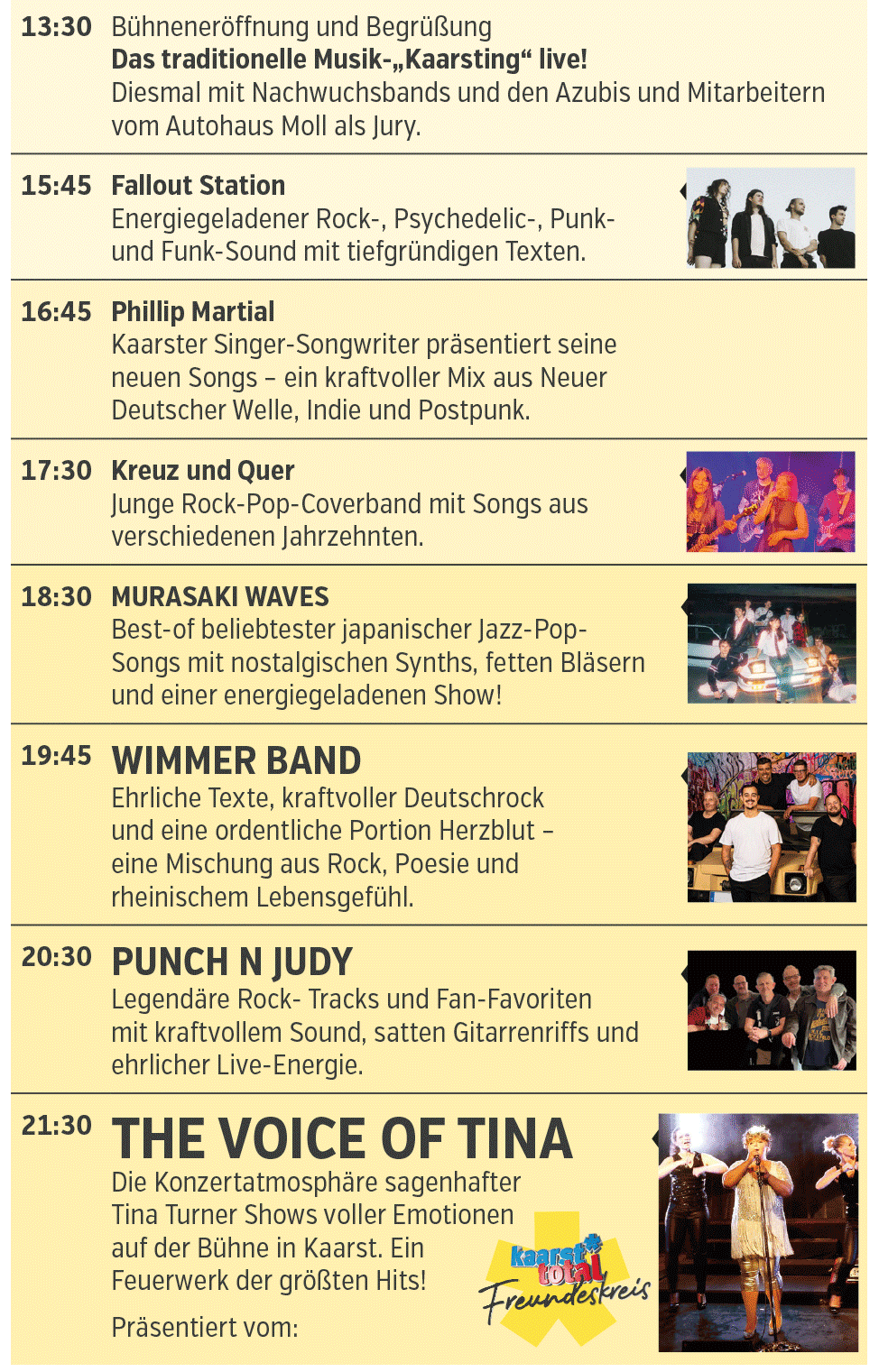 Den aktuellen Flyer mit dem Bühnenprogramm und vielen Infos finden Sie ab sofort in vielen Kaarster Geschäften und an den meisten Bühnen und Ständen bei Kaarst Total.