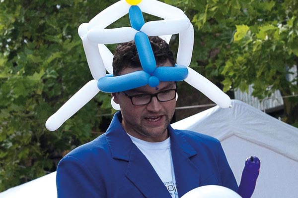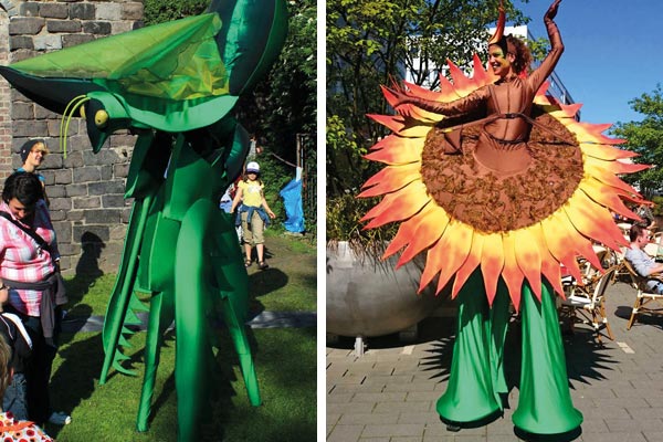 Stelzenparade: Riesige Sonnenblumen und eine Gottesanbeterin werden die Besucher mit Blütenblättern und lebenslangem Glück überschütten.