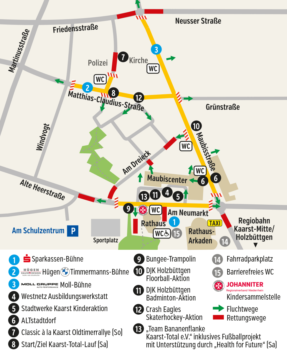 Das Epizentrum von Kaarst Total entfaltet sich um die vier Großbühnen am Rathaus (Am Neumarkt), in der Matthias-Claudius-Straße und in der Maubisstraße.